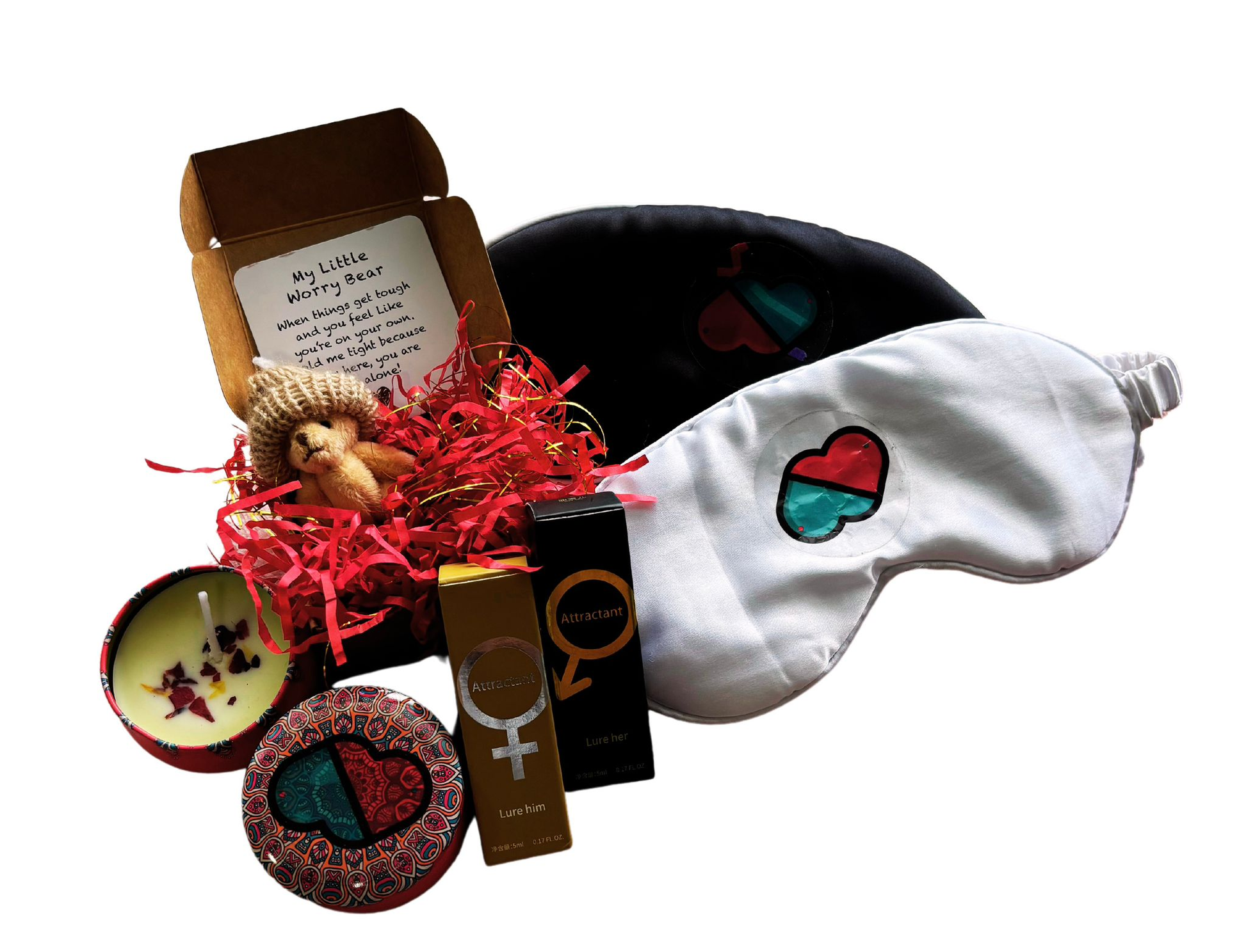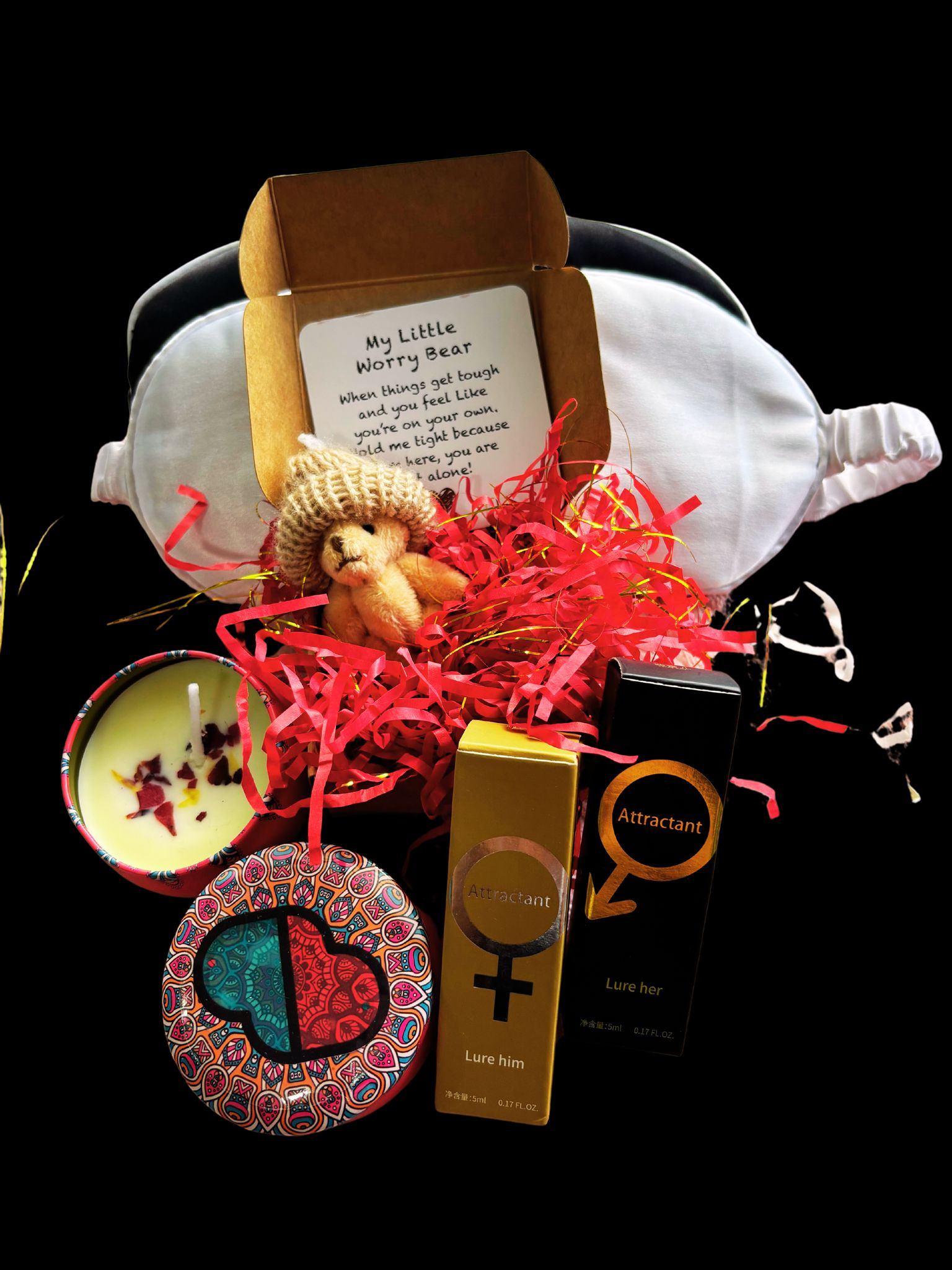 "Indulge in a soothing blend of comfort and romance with our Hug teddy and rose sensational kit from Couples World. This thoughtful gift set combines the adorable companionship of a worry teddy bear with the calming ambiance of a rose-scented candle. Perfect for creating a serene and intimate atmosphere for your partner at home. This box reminds you of love, care, and tranquility to fill the space with your love and comfort.